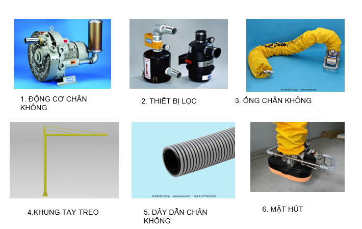 - Thiết bị gồm nhiều loại quạt gió với nhiều kích cỡ quy cách khác nhau lắp ghép với các ống treo để hút hàng hóa và vật liệu có trọng lượng và chất liệu khác nhau